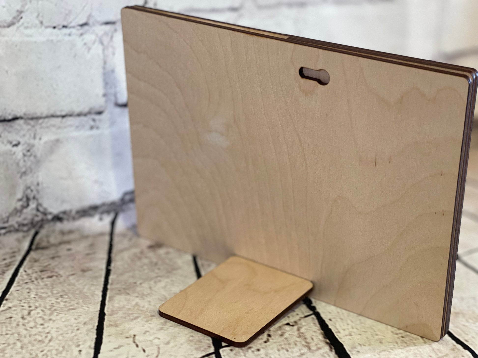 Made from engraved Baltic Birch. There is a eye hole on the back for easy hanging, or use the included stand to set the frame on a shelf or table.