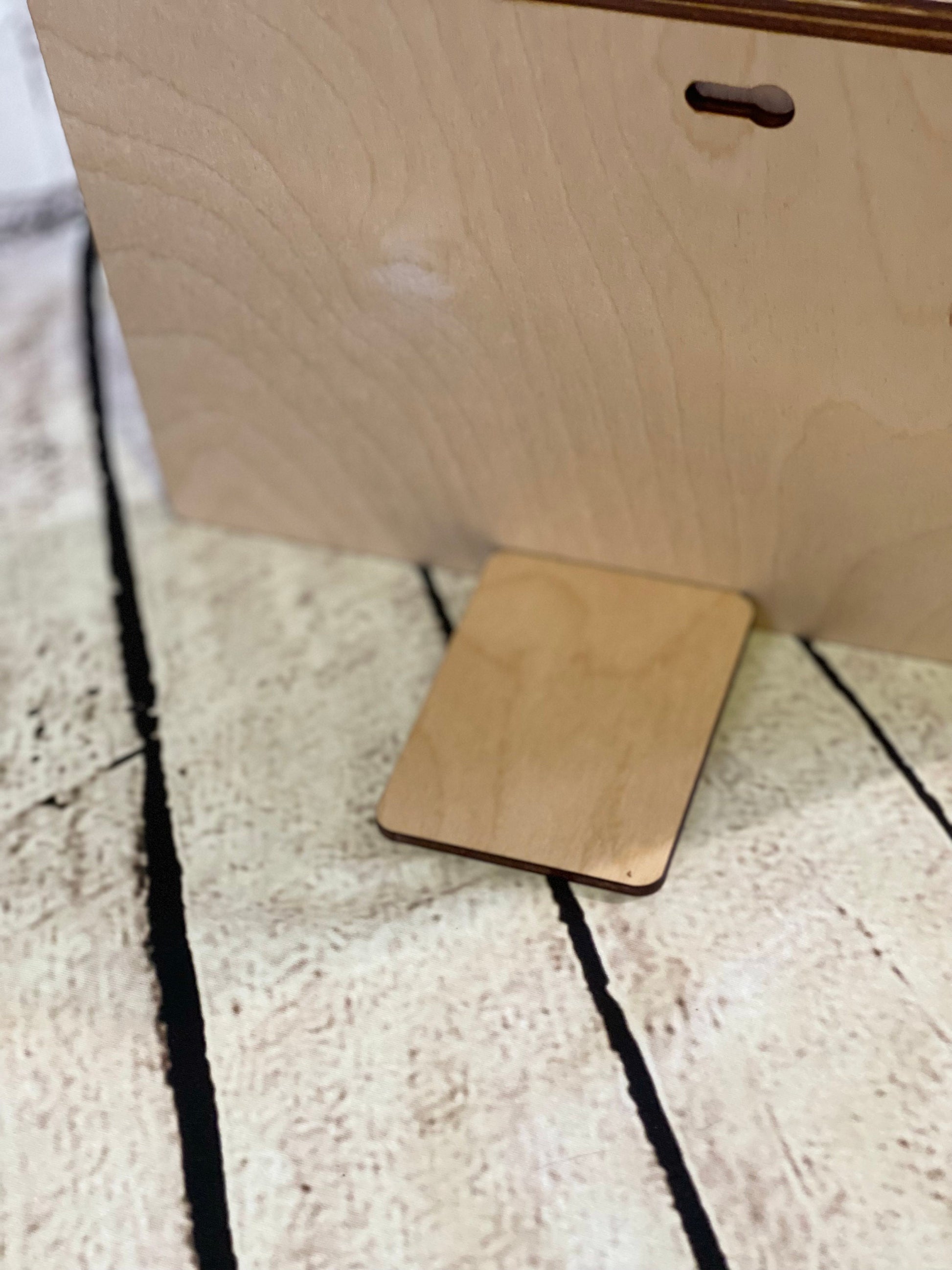 Made from engraved Baltic Birch. There is a eye hole on the back for easy hanging or use the included stand to set the frame on a shelf or table. Fits 3.5" x 5.5" picture.