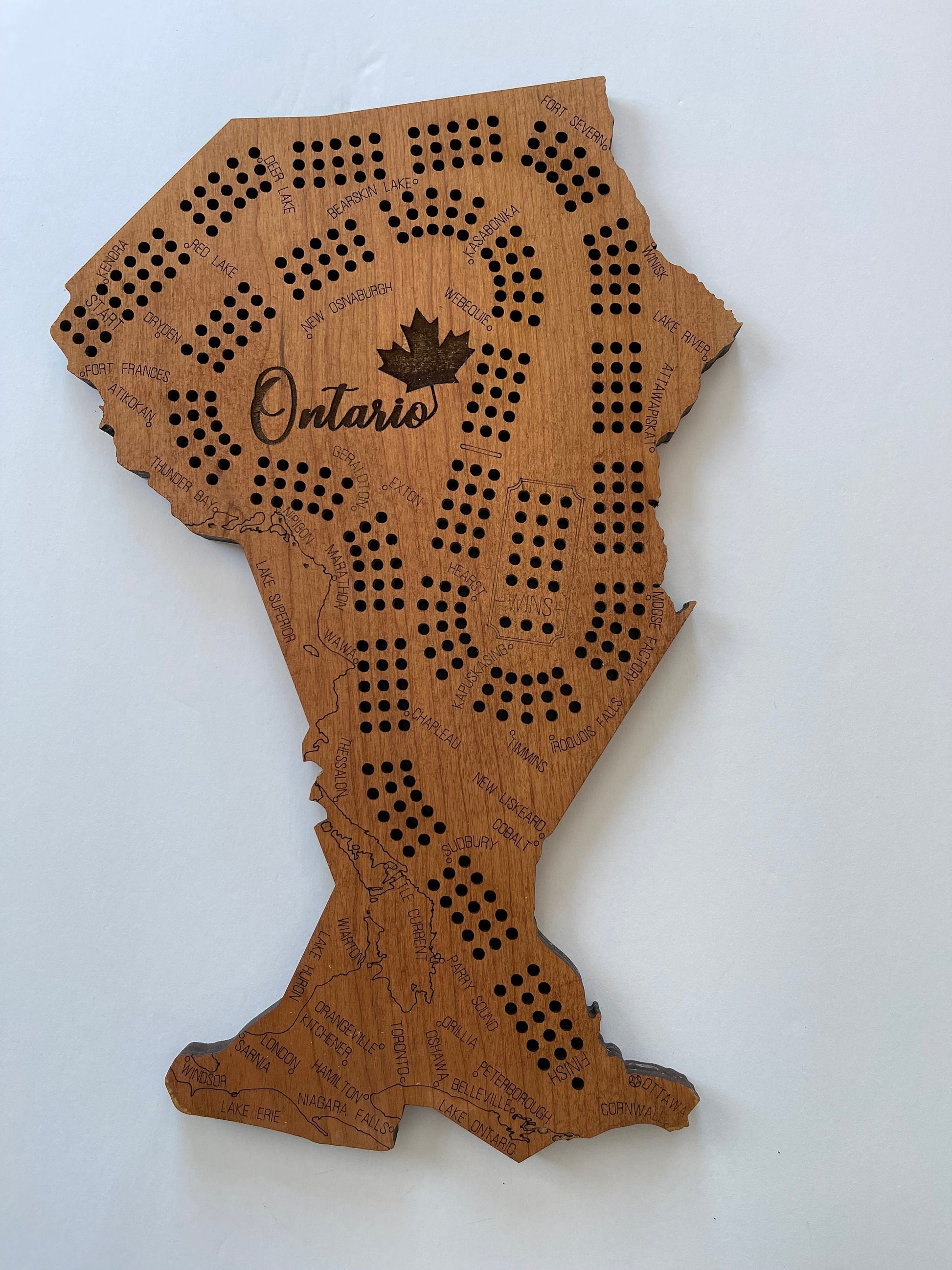 Looking for the perfect custom gift for the cribbage lover in your life? Look no further than this beautifully crafted Ontario Cribbage Board. Each board is laser engraved with intricate details of Ontario cities, making it a truly unique and personalized gift.