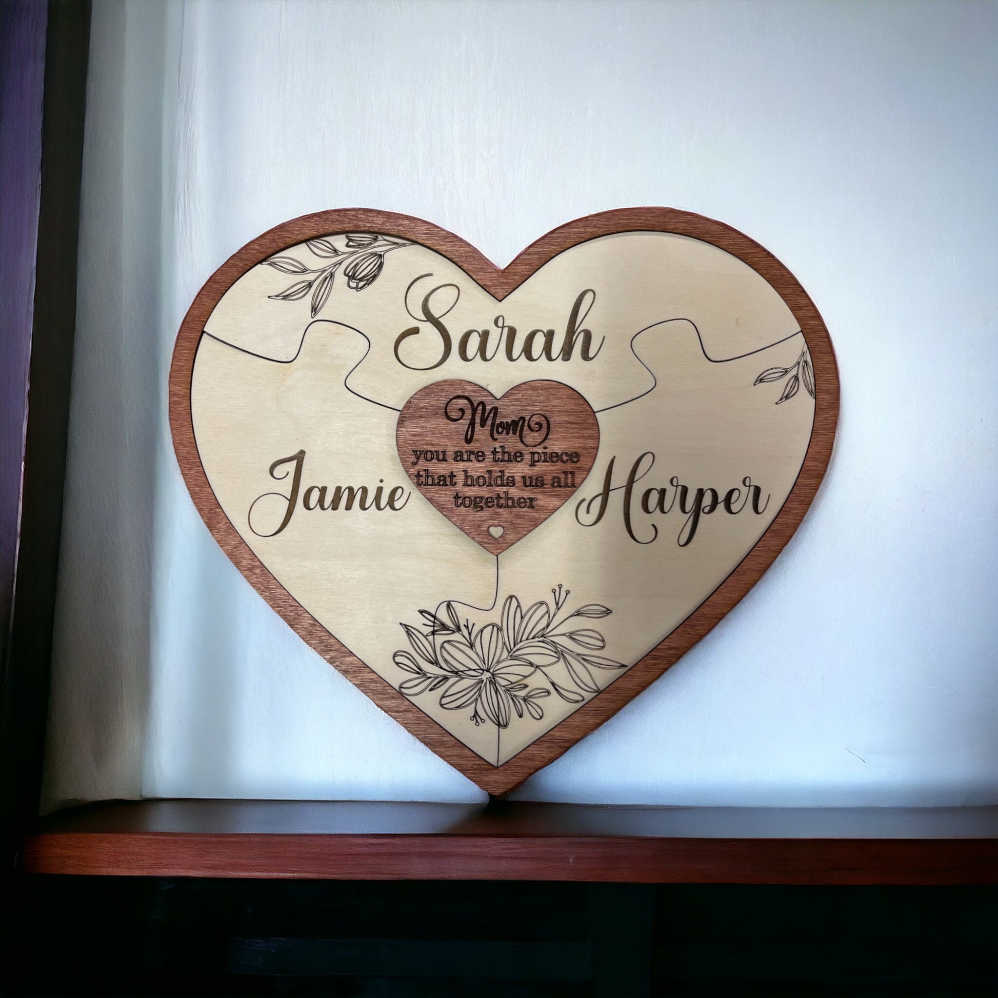 Personalized Engraved Baltic Birch Wood Heart Puzzle Piece Sign with Wild Flowers - Mom you are the piece that holds us together Sign -