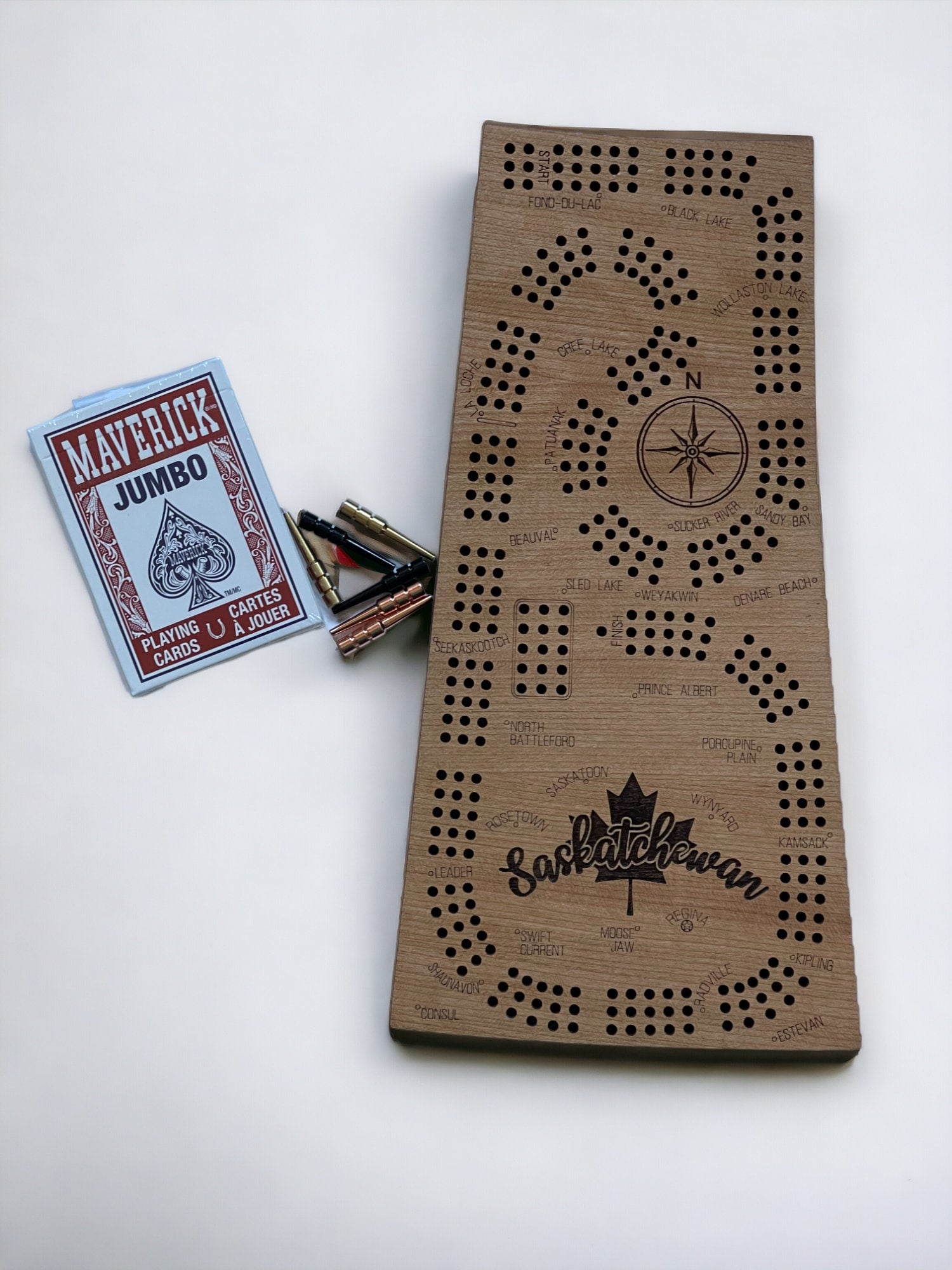 Don't worry about searching for pegs and cards separately! Our Saskatchewan Cribbage Board comes complete with matching pegs and one deck of playing cards, making it perfect for immediate use. Everything you need to start playing right away is included, so gather your friends and family for endless hours of entertainment.